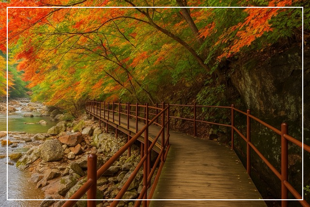 먼저 뱀사골은 반선 주차장에서 시작해 요룡대까지 이어지는 약 2km 구간으로 구성돼 있으며, 비교적 짧고 완만한 경사로 이루어져 있어 트래킹 초보자나 가족 단위 방문객에게 매우 적합합니다. 특히 초입에는 무장애 탐방로가 1.3km가량 조성돼 있어, 유모차나 휠체어를 사용하는 분들도 쉽게 접근할 수 있다는 장점이 있습니다. 이 코스의 절정은 10월 중순~말이며, 돗소와 요룡대 같은 명소에서는 단풍나무 터널과 기암절벽, 옥색 물웅덩이 등이 어우러진 시원한 풍경을 즐길 수 있습니다. 더불어 반선 주차장은 넓고 무료이며, 탐방센터에 다양한 전시 시설이 갖춰져 있어 가벼운 하루 코스로 손색이 없습니다.